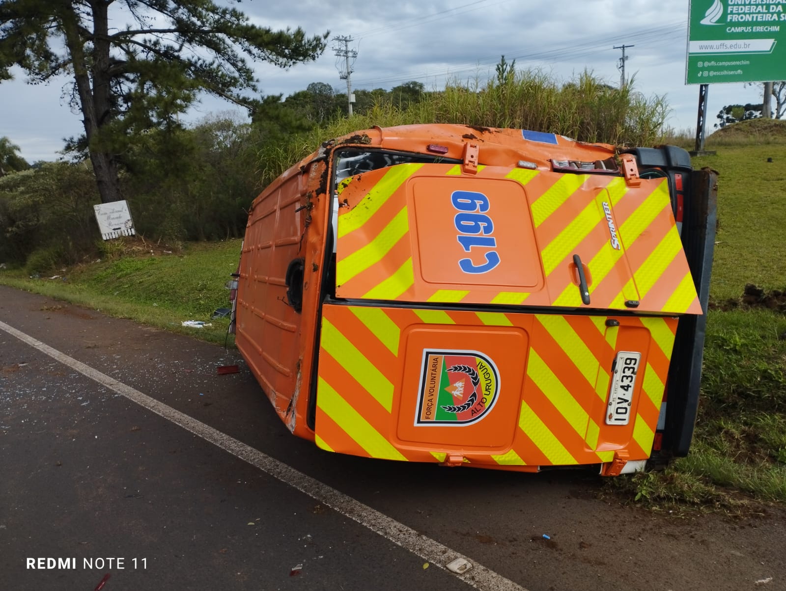 Ambulância da Força Voluntária capota após ter trajeto interrompido por carro na RS-135 em Erechim