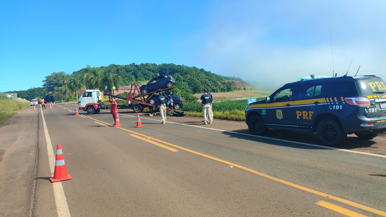 Houve interrupção temporária do fluxo de veículos, mas o trânsito já foi restabelecido. A PRF permaneceu no local realizando a orientação do trânsito e os levantamentos para o laudo pericial. As causas serão apuradas.