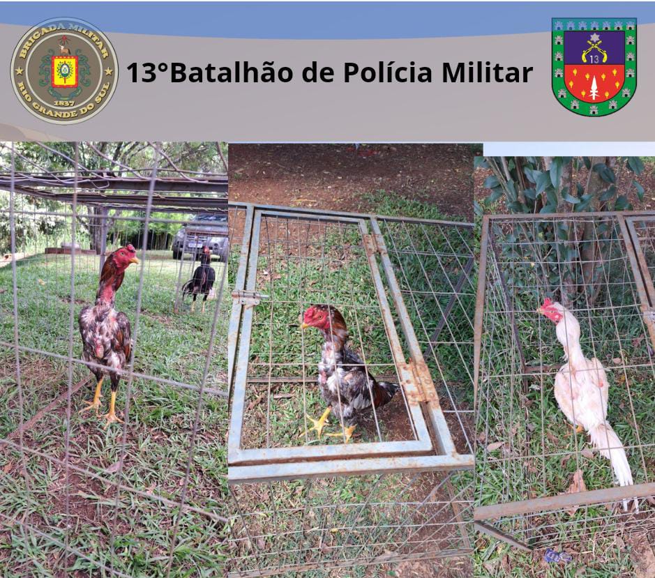 Após denúncias de maus- tratos, uma guarnição da Brigada Militar, deslocou na rua Antonio Gauer, onde localizou quatro galos em gaiolas separadas em frente à uma residência e constataram que as aves apresentavam lesões.