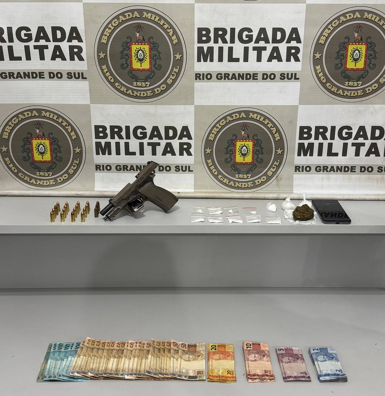 Durante a abordagem, os policiais localizaram e apreenderam uma pistola calibre 9 milímetros, acompanhada de um carregador e 19 munições intactas do mesmo calibre. Além da arma, foram encontradas 12 porções de substância com características semelhantes à cocaína, uma porção de substância análoga à maconha e uma quantia em dinheiro.