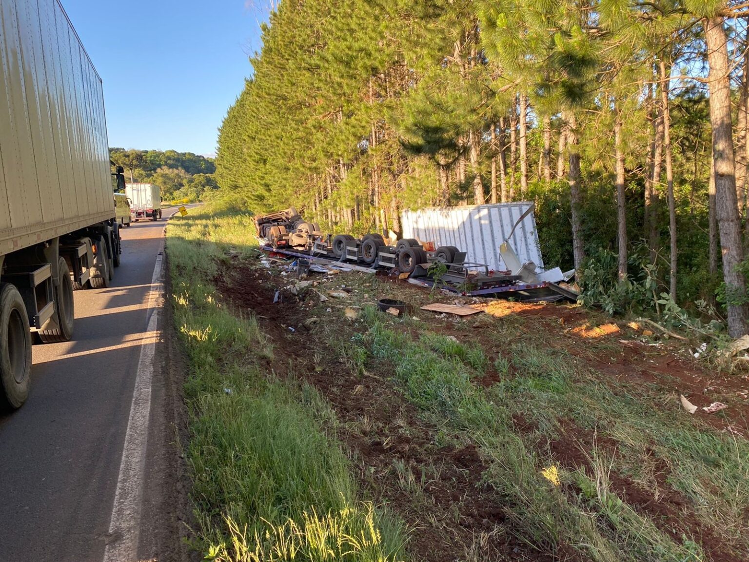 Por volta das 17h desta sexta-feira, 04, o condutor de uma carreta com placas de Barueri/SP, perdeu o controle da direção quando um dos eixos saiu fora da pista na ERS 135 em Sertão, no trecho onde não tem acostamento e acabou tombando.