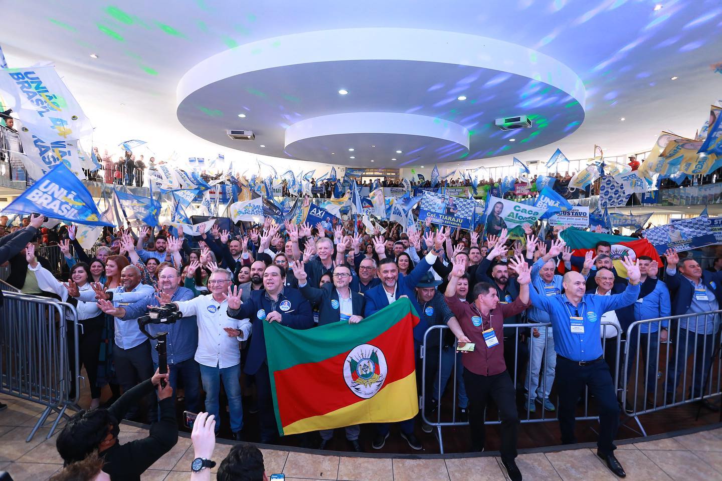 A convenção partidária do União Brasil foi realizada neste domingo (24), no Clube Farrapos, em Porto Alegre, oficializando as candidaturas de deputado estadual e federal que irão disputar as eleições de outubro. Além do presidente estadual, Luiz Carlos Busato, deputados, candidatos e lideranças da sigla, o evento foi prestigiado pelo governador Ranolfo Vieira Júnior (PSDB) e pelo pré-candidato a governador Eduardo Leite (PSDB). Aproximadamente duas mil pessoas passaram pelo evento, que começou às 8h30 e terminou por volta das 13h. O União Brasil terá 56 candidatos à Assembleia Legislativa e 32 à Câmara Federal, preenchendo o número máximo de candidaturas a que cada partido tem direito.