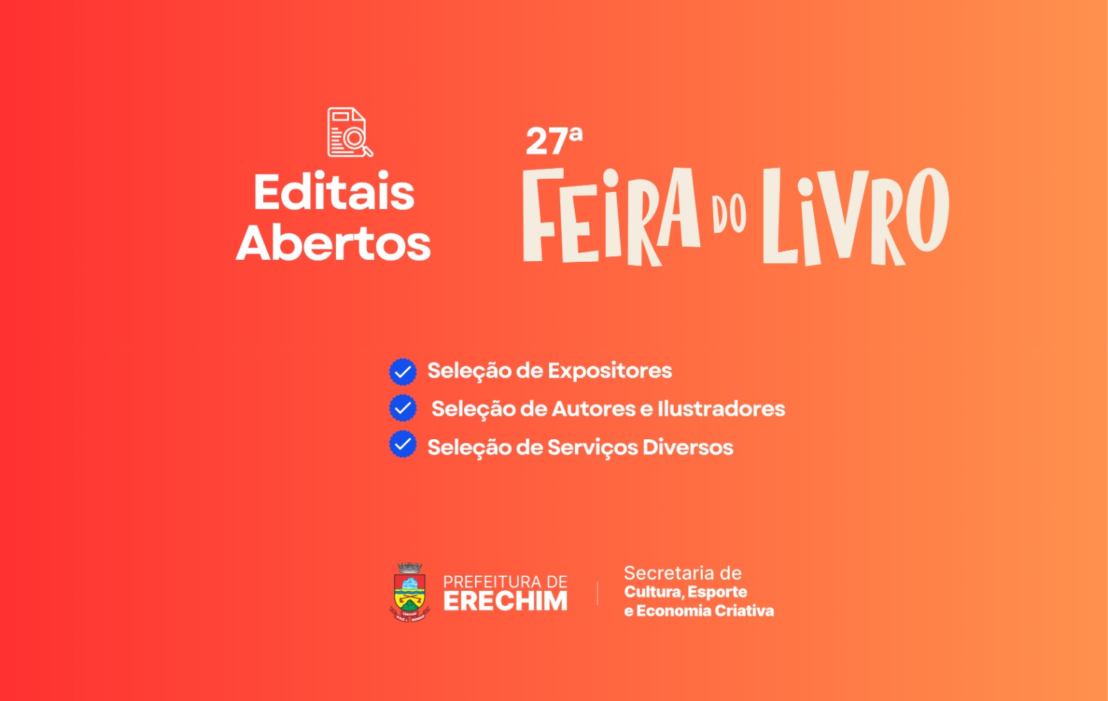 A Prefeitura de Erechim, por meio da Secretaria Municipal de Cultura, Esporte e Economia Criativa de Erechim, iniciou os preparativos para a 27ª edição da Feira do Livro de Erechim com a abertura de três editais públicos destinados à seleção de participantes e prestadores de serviços. Os chamamentos buscam ampliar a participação de profissionais do setor cultural e incentivar a literatura, a economia criativa e a circulação de livros e autores durante o evento.