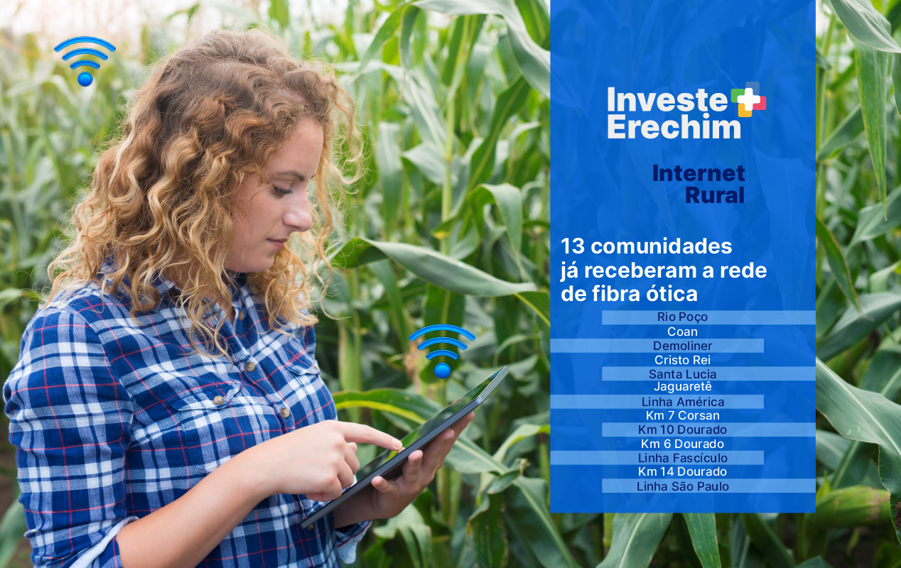 A internet gratuita para 34 comunidades rurais de Erechim está se tornando realidade. A iniciativa da Prefeitura de Erechim, por meio da Secretaria de Agricultura e do programa Investe + Erechim, visa oportunizar tecnologia, acesso à cultura, conhecimento, mas, principalmente, bem-estar às famílias rurais.Os investimentos chegam a R$ 360 mil.