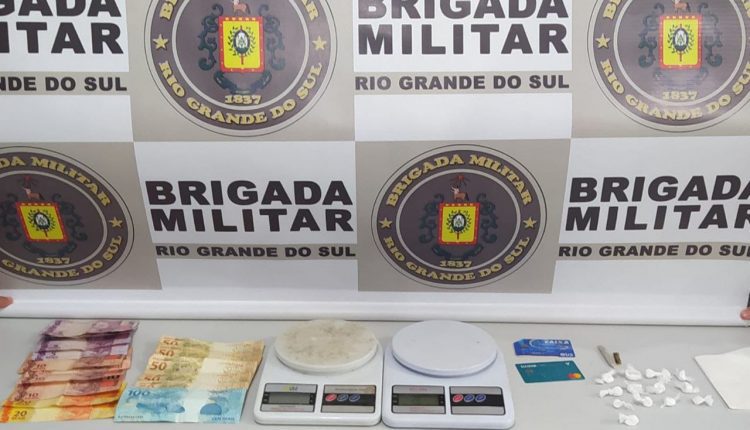 Na ação foram apreendidos 13 porções de cocaína pesando 9,46 gramas, dois cigarros de maconha, duas balanças de precisão, um celular e R$450 em moeda corrente.