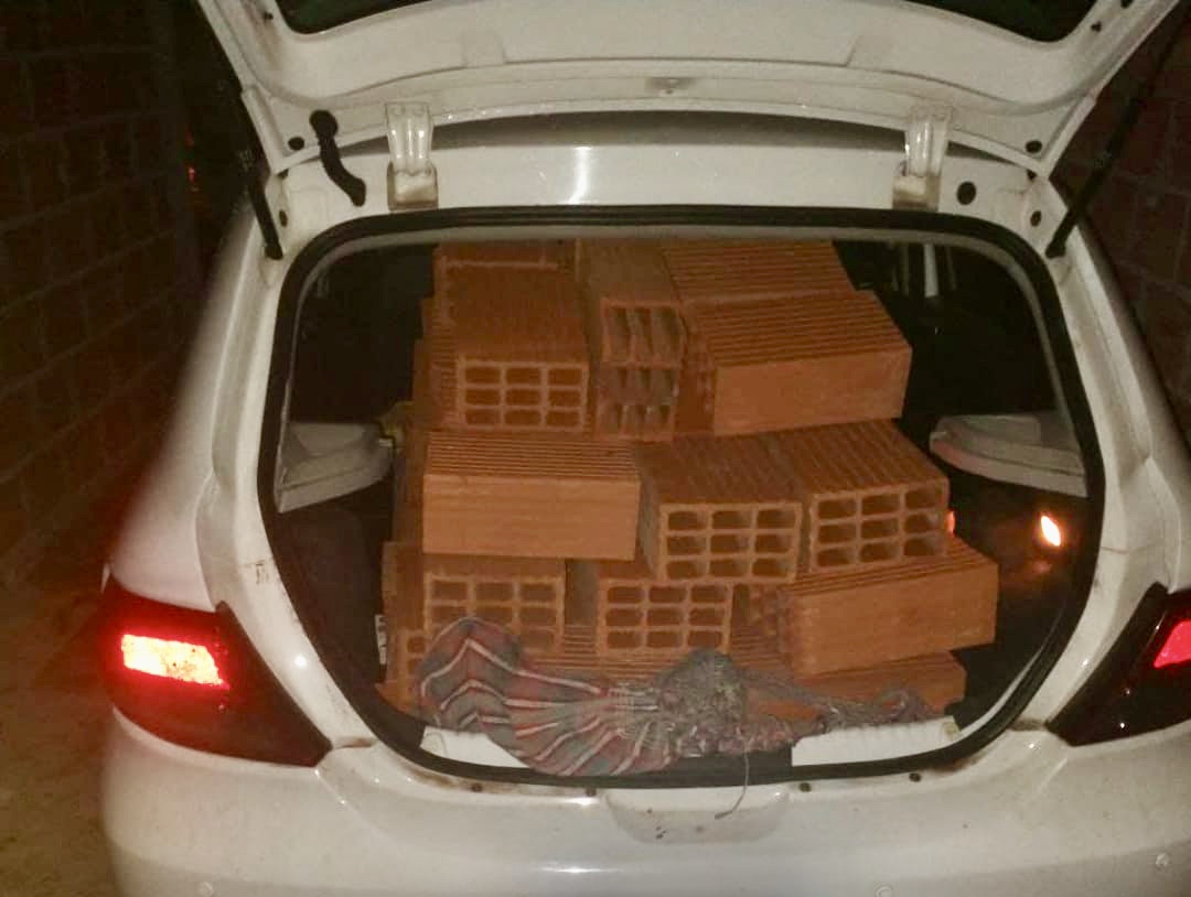 Após informações de um furto de materiais de construção na rua Otávio Gaik, policiais militares iniciaram diligências e localizaram um veículo estacionado na garagem de uma construção com o porta-malas carregado com tijolos.