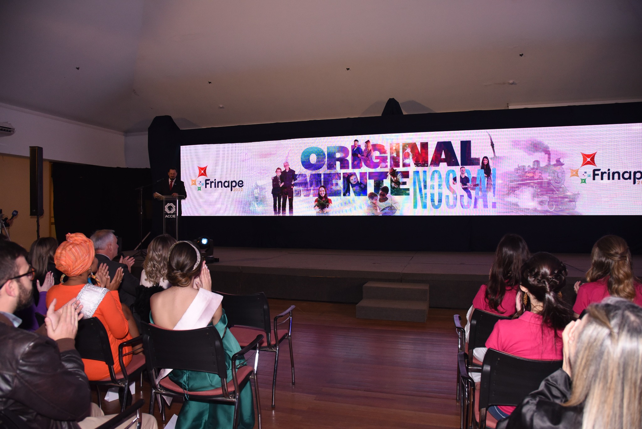 Foi lançada oficialmente, na noite desta sexta-feira (5), a Frinape 2022, com a apresentação das candidatas à Rainha, princesas étnicas, prenda, principais atrativos, novidades e programação da feira, além do conceito da edição deste ano, assim como o jingle. O evento foi realizado no Auditório do Pólo de Cultura e contou com a presença de mais de 300 convidados, autoridades e imprensa. O lançamento foi prestigiado pelo prefeito de Erechim, Paulo Polis; presidente da AMAU, o prefeito de Getúlio Vargas, Mauricio Soligo; presidente do Poder Legislativo de Erechim, Alessandro Dal Zotto; presidente da Sicredi UniEstados, Adelar Parmeggiani; presidente do Conselho de Desenvolvimento de Erechim, Mário Cavaletti. presidente do Conselho Deliberativo da ACCIE, Claudionor Mores; Rainha da Frinape 2022, Talita Lorenzetti, e Princesas Étnicas de 2022; vereadores, secretários municipais, expositores, dirigentes de entidades e de instituições de ensino, entre outros.