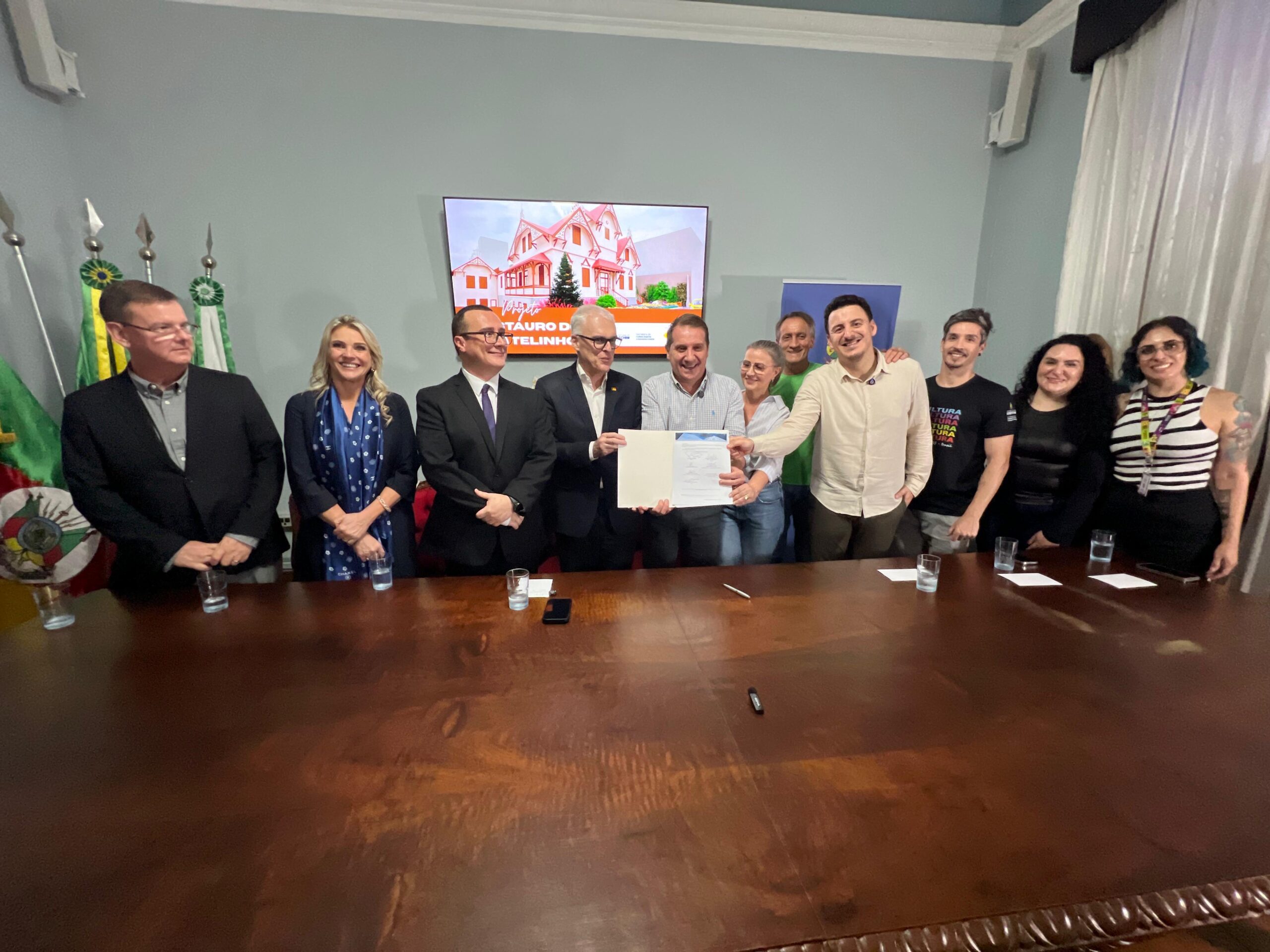 O Ministério Público do Estado do Rio Grande do Sul realizou, no fim da tarde desta quarta-feira (22), a assinatura do Termo de Convênio com a Prefeitura de Erechim para a execução do projeto “Restauração da Antiga Comissão de Terras do Estado do Rio Grande do Sul – Castelinho de Erechim”. A cerimônia ocorreu no Salão Nobre da Prefeitura e marca um avanço significativo na preservação do patrimônio histórico e cultural do município, com recursos viabilizados pelo Fundo para Reconstituição de Bens Lesados (FRBL).
