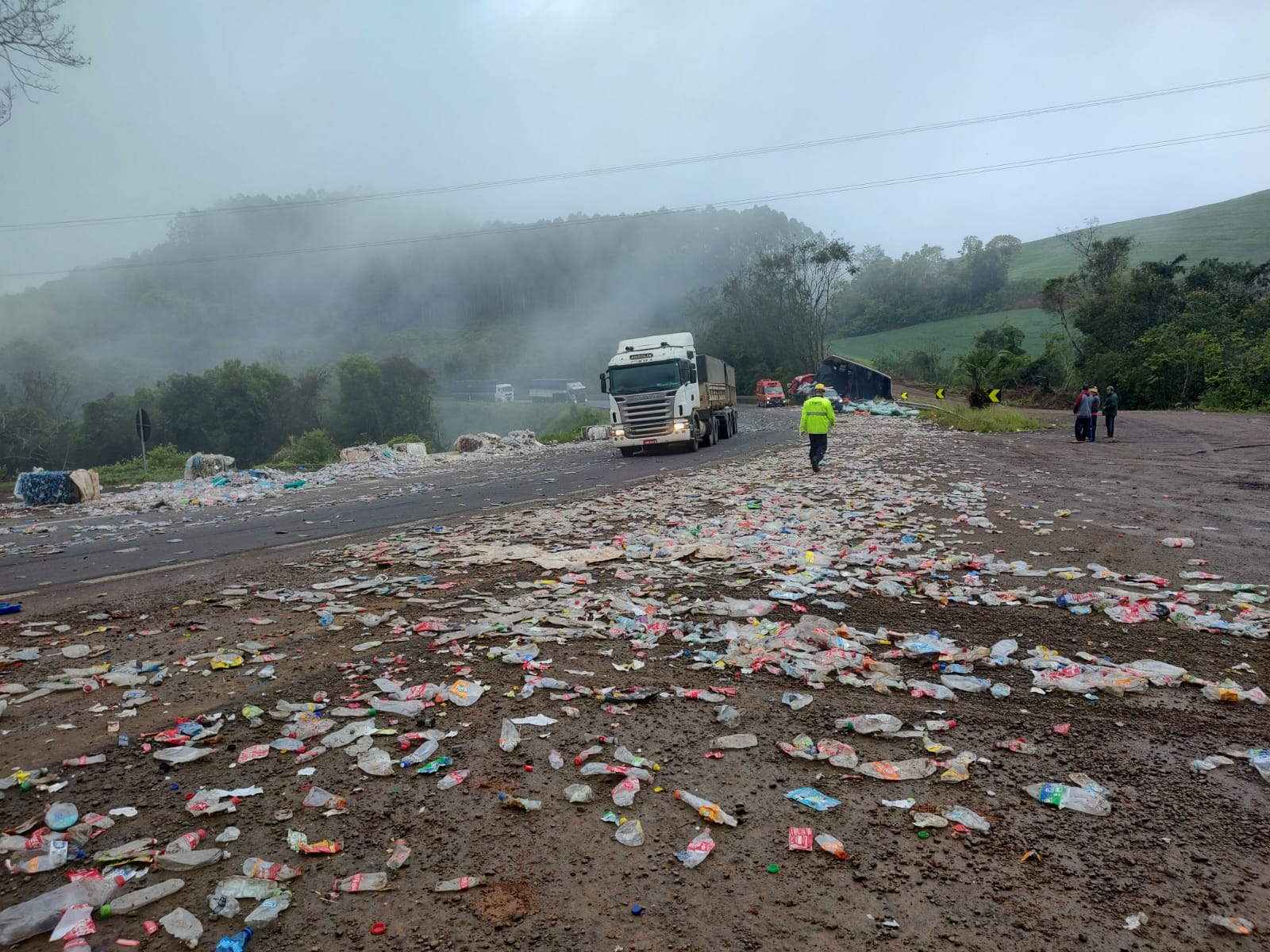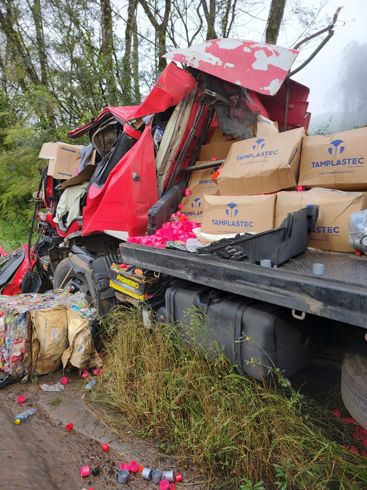 De acordo com os levantamentos realizados pela equipe PRF no local, o caminhão de Araucária seguia no sentido Concórdia/SC – Erechim/RS quando, ao fazer uma curva, ocorreu queda de parte da sua carga de blocos de garrafas Pet prensadas. Alguns dos blocos atingiram a cabine do segundo veículo que transitava no sentido oposto.