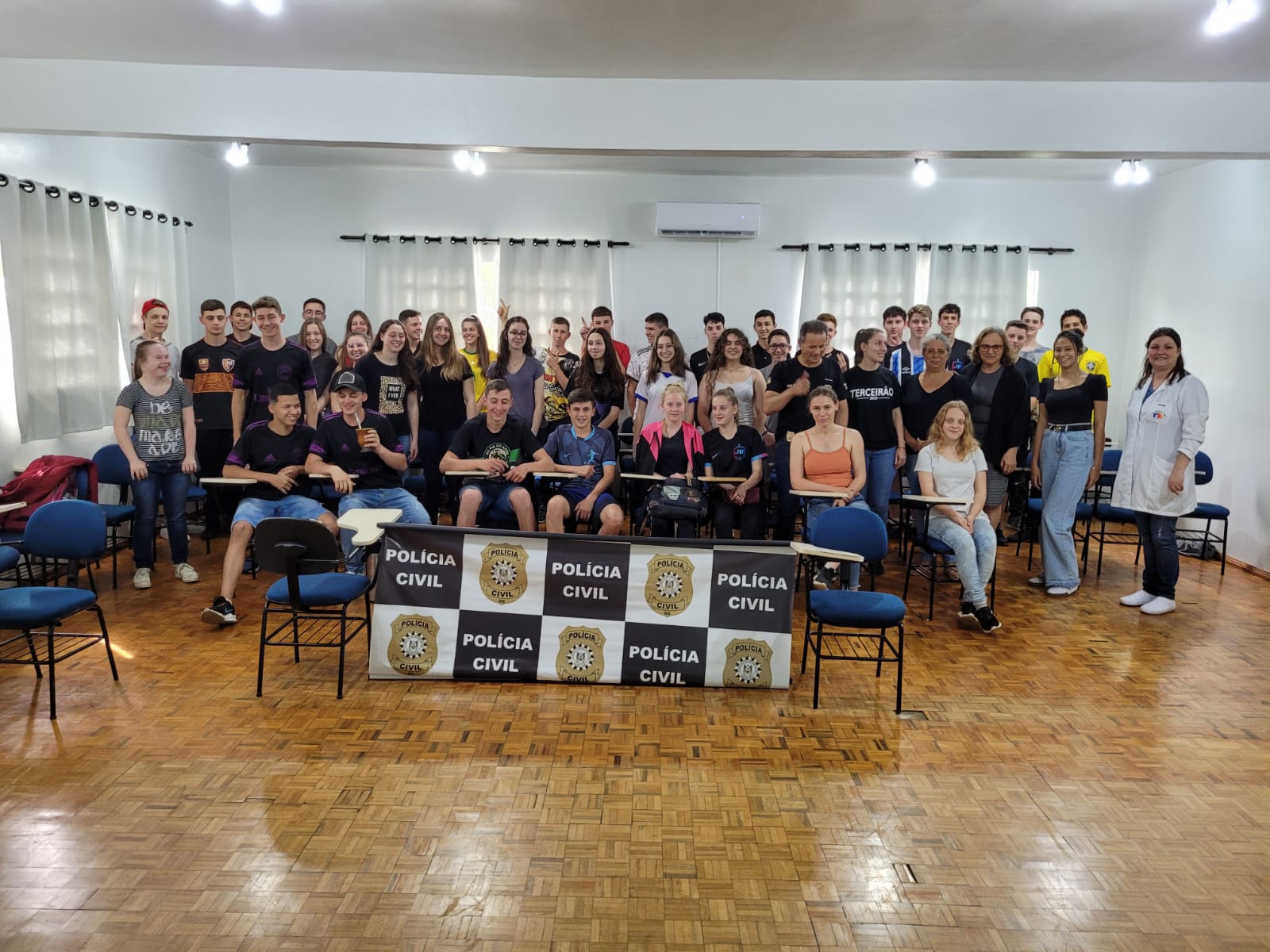 Nesta quarta-feira, 05 de outubro de 2022, a Polícia Civil, através do Delegado de Polícia Germano Alves de Lima, realizou mais uma etapa do Programa “Papo de Responsa” na Escola Estadual de Ensino Médio José Bisognin, em Severiano de Almeida/RS.