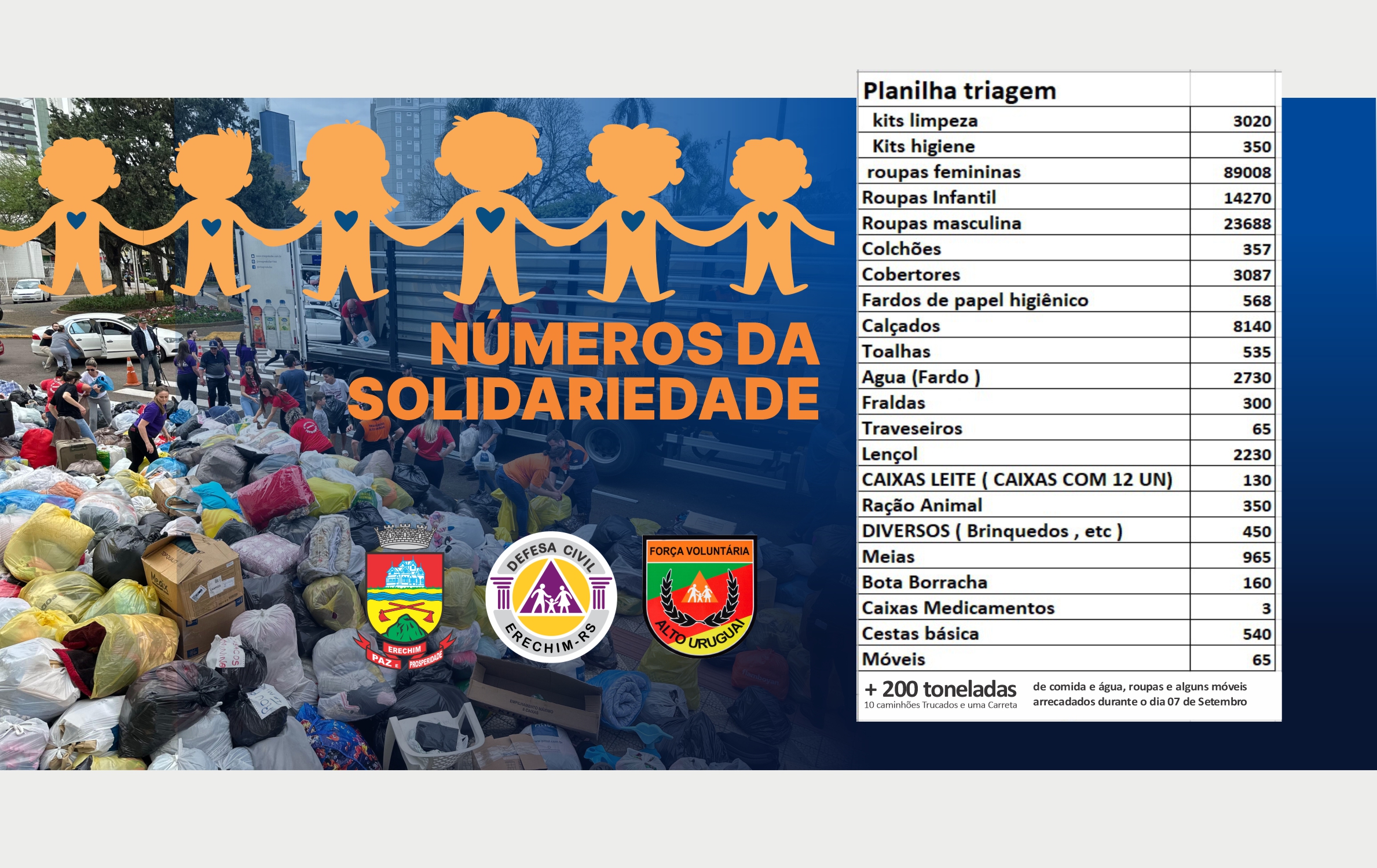 A Prefeitura de Erechim, Defesa Civil de Erechim e a Força Voluntária Alto Uruguai prestam contas de tudo que foi arrecadado na quinta-feira (7 de setembro), e na central estadual de triagem do Parque da Associação Comercial, Cultural e Industrial de Erechim (ACCIE), na sexta (8), sábado (9) e domingo (10), em que mais de dois mil voluntários se dedicaram na seleção das doações que vieram de diferentes locais do Rio Grande do Sul e foram enviadas aos municípios do Vale do Taquari.