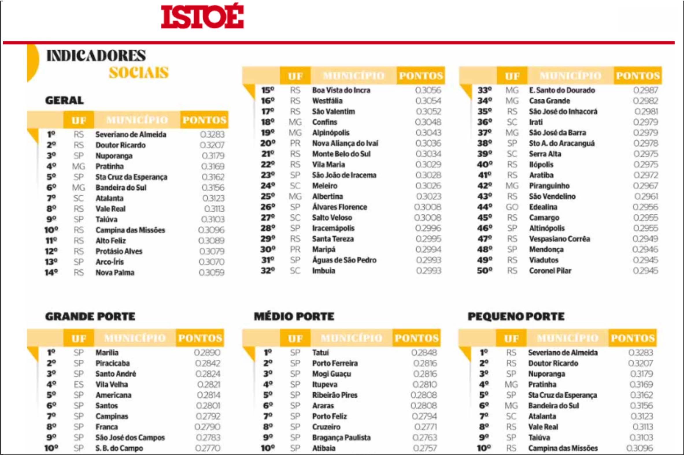 Severiano de Almeida acaba de ser anunciada como a principal cidade brasileira em pesquisa realizada pela Austin Rating e publicada pela revista IstoÉ, um dos principais periódicos do País, em indicadores de responsabilidade social.